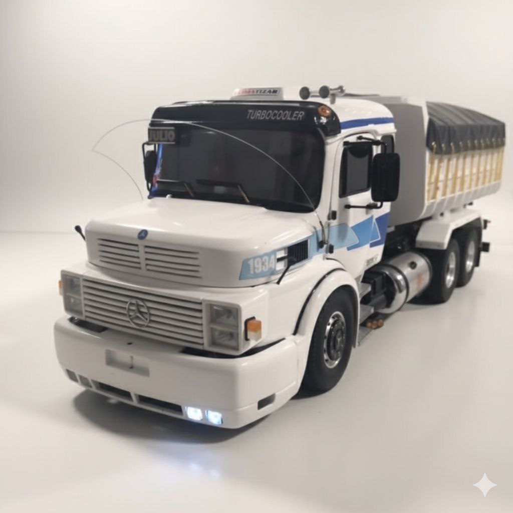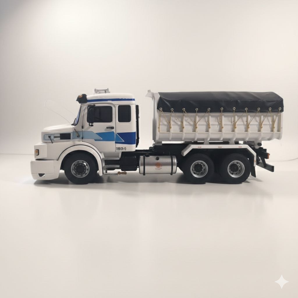 Com pintura branca com faixas azuis, caçamba basculante com lona preta, iluminação LED e estrutura em ABS + metal, essa miniatura é o equilíbrio perfeito entre nostalgia e tecnologia — feita pra quem ama caminhão de verdade e quer ver o bruto rodando no chão da sala.